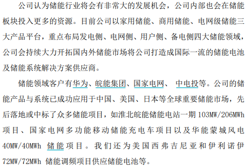 目前,国轩高科以家用储能、商用储能、电网级储能三大产品平台,重点布局发电侧、电网侧、用户侧、备电侧四大储能领域。据披露,公司储能领域客户有华为、皖能集团、国家电网、中电投等,储能产品与系统已应用于中国、美国、日本等重要储能市场。
