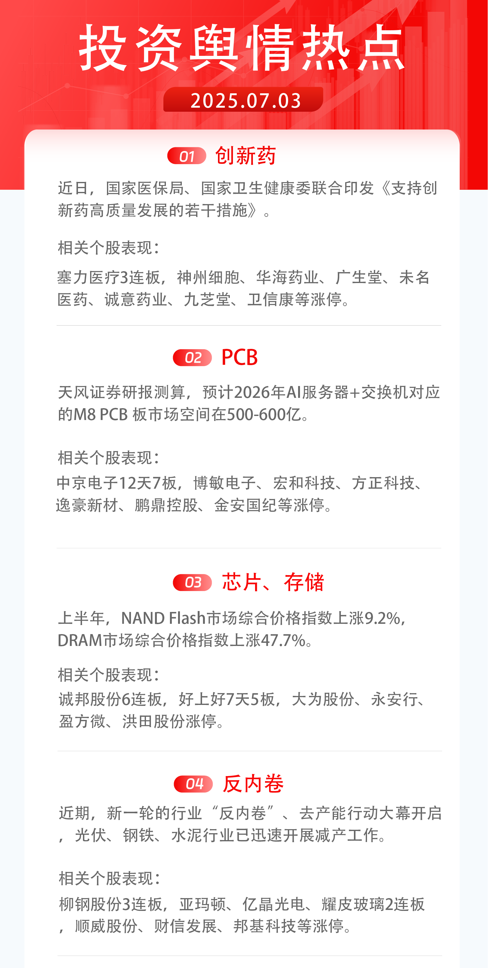 7月3日舆情热点:创新药、PCB板、存储芯片