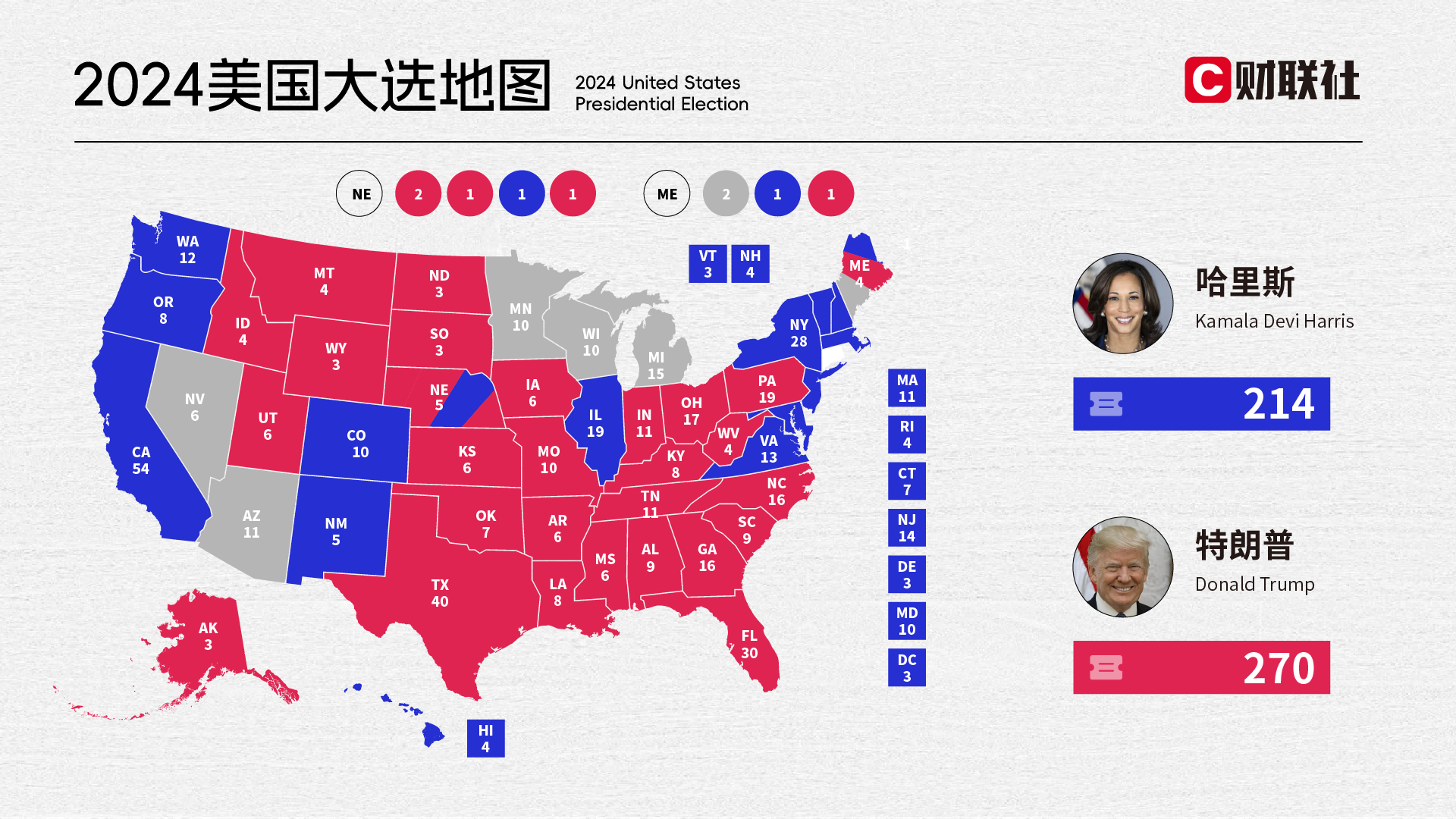 在此次选举中,特朗普在7个关键摇摆州都选情占优。在美媒预测他先后赢下北卡罗来纳州、佐治亚州和宾夕法尼亚州之后,他已经基本锁定了胜局。