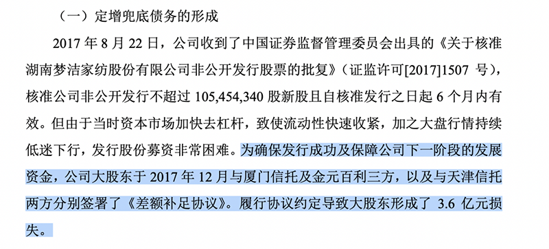 据悉,2017年8月,梦洁股份收到证监会,核准公司非公开发行1.05亿股,且自核准之日起,6个月内有效。由于当时资本市场加快去杠杆,再加上受到大盘行情下行影响,梦洁股份为了保障这一募资能够顺利进行,公司便与厦门信托和金元百利三方,以及和天津信托,分别签署了《差额补足协议》。2021年,因为触发了定增兜底协议约定的差额补足义务,使得梦洁股份大股东形成3.6亿元的定增兜底债务。