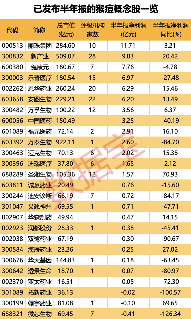 截至目前,已有26家猴痘概念股发布半年报。从净利润规模看,丽珠集团、新产业、健康元、国药现代居前,依次为11.71亿元、9.03亿元、7.76亿元、7.18亿元;其后乐普医疗、恩华药业、安图生物等股净利润在6亿元以上。