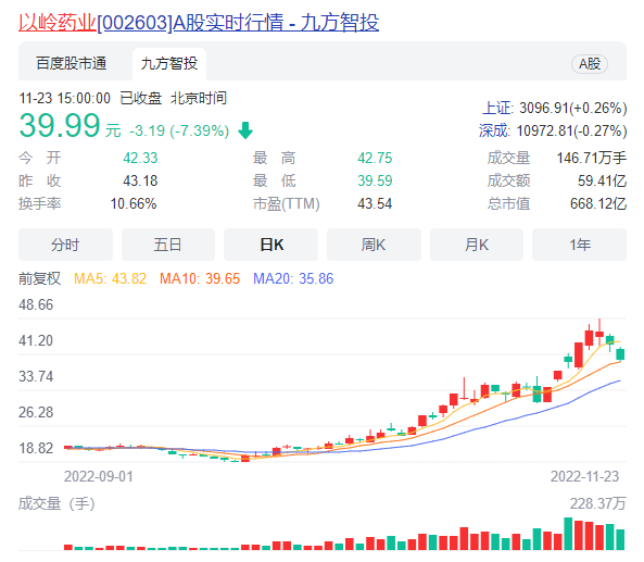 行情数据显示,9月底至今不到两个月的时间,以岭药业股价从18.8元左右一路上涨。尤其是进入11月以来,伴随着成交量的放大,以岭药业因股价持续大涨两次发布异动公告,并于11月21日触及48.66元/股的历史新高。不过,近两个交易日股价有所回调,最新报收39.99元。