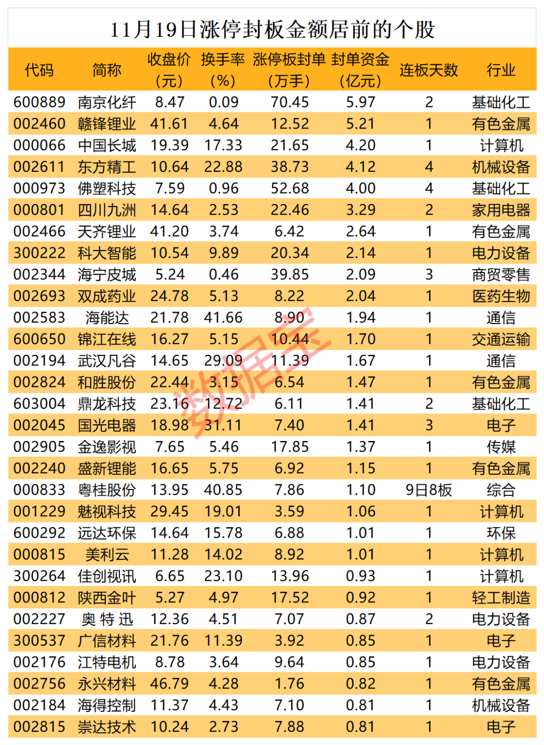 以封单金额计算,22股封单超1亿元,其中南京化纤、赣锋锂业、中国长城封单金额居前,分别为5.97亿元、5.21亿元、4.2亿元。