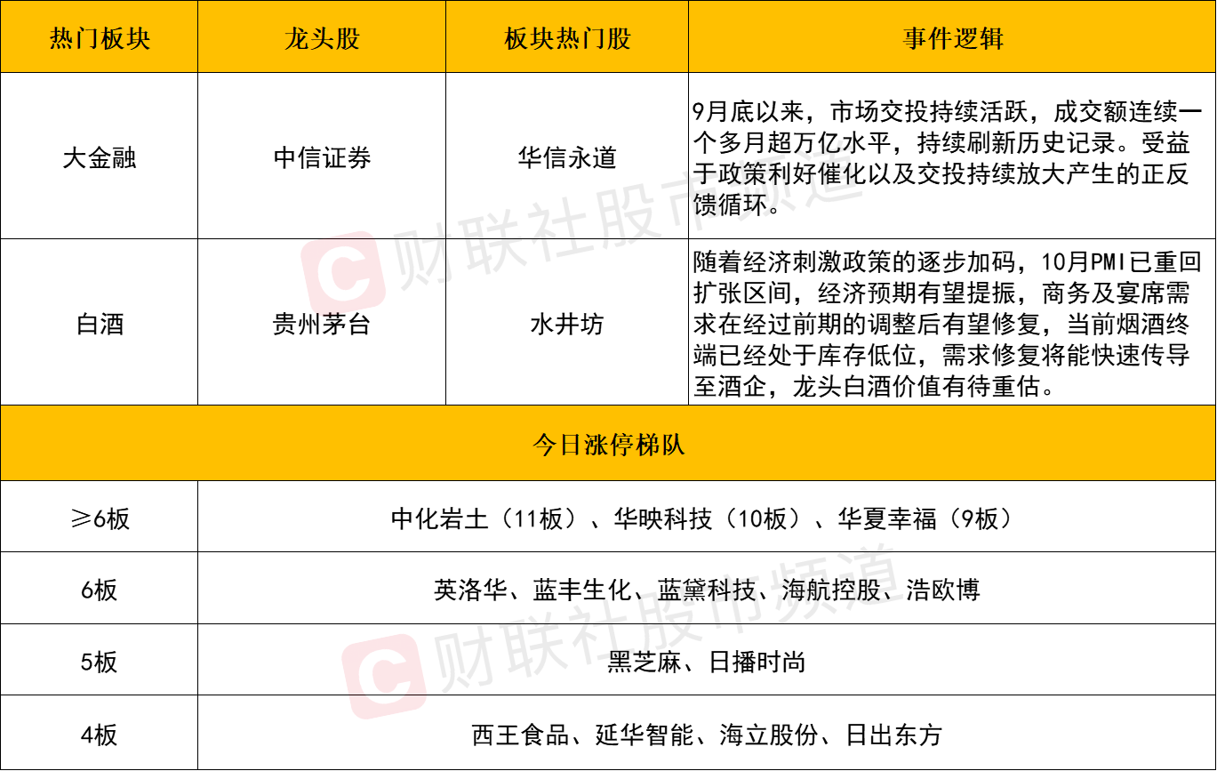 大金融午后再度拉升,中信证券、中信建投、首创证券、华林证券、中国人寿、赢时胜等个股涨停。9月底以来,市场交投持续活跃,成交额连续一个多月超万亿水平,持续刷新历史记录。受益于政策利好催化以及交投持续放大产生的正反馈循环,大金融个股的估值或仍存进一步拔高之空间。
