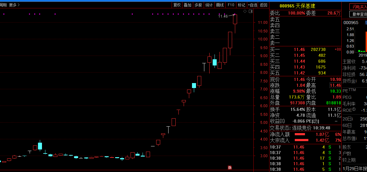 4月12日早盘,天保基建再度涨停,报11.46元,为近3个交易日连续涨停,也是近18个交易日里的第14个涨停。