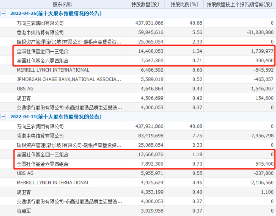 公司披露的两次十大股东持股数据显示,4月1日至4月27日,社保基金四二零组合较一季末加仓44.954万股,同时,社保基金一一零组合新入917.3万股,两只社保基金合计持股市值达3亿元。