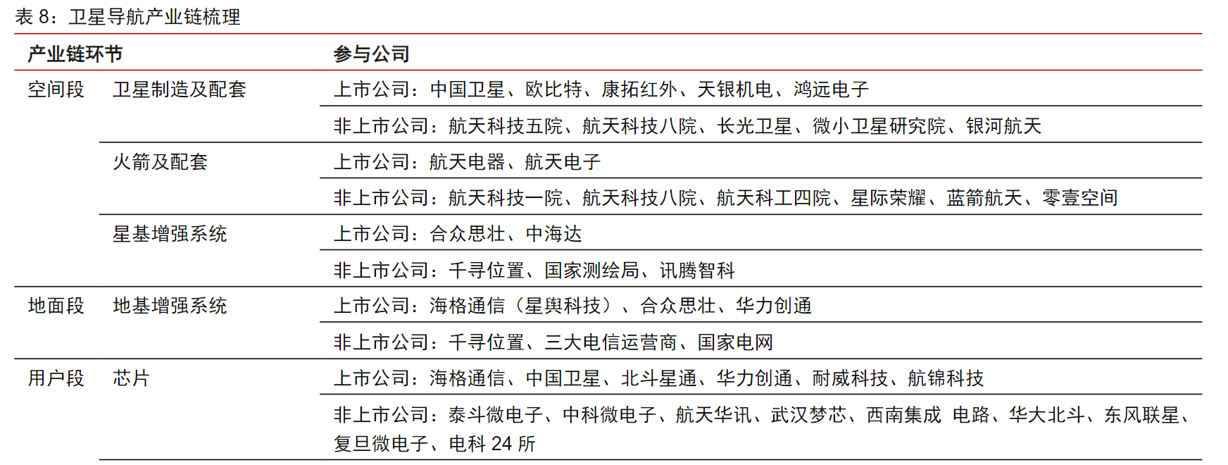 在空间段领域卫星制造及配套方面,参与企业主要有中国卫星、欧比特、康拓红外、天银机电、鸿远电子;火箭及配套方面涉及上市公司为航天电器、航天电子;星基增强系统方面参与企业主要有合众思壮和中海达。地面段领域地基增强系统方面涉及上市公司为海格通信(星舆科技)、合众思壮、华力创通。