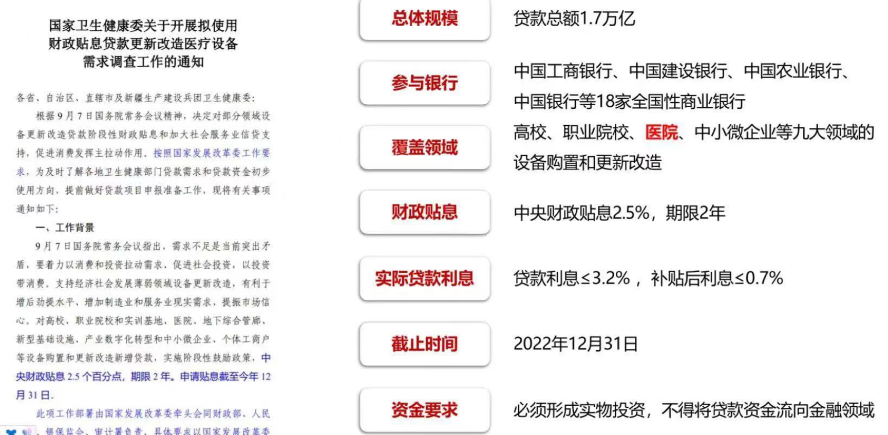 一则《国家卫健委关于开展拟使用财政贴息贷款更新改造医疗设备需求调查工作的通知》消息在市场上引起关注。该通知称,了解各地卫生健康部门贷款需求和贷款资金初步使用方向,提前做好贷款项目申报工作。值得注意的是,该消息未经证实。