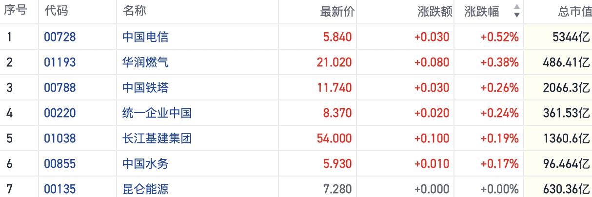 市场风险偏好转弱背景下,多家高股息的中字头个股逆势翻红。截至发稿,中国电信(00728.HK)涨近1%,创近一周新高,华润燃气(01193.HK)、中国铁塔(00788.HK)等个股也纷纷跟涨。