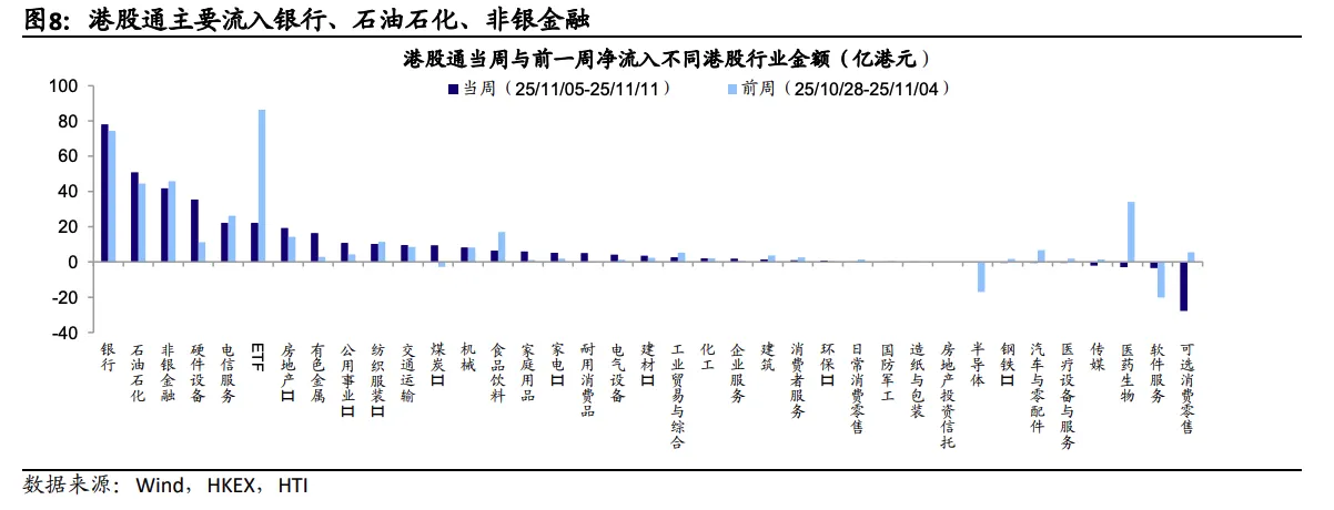 此外,海通国际研究还显示,随着11月行情深入,以港股通为代表的内资也开始加仓银行、石油石化、非银金融等红利板块。