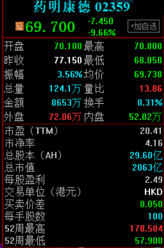 港股方面,药明康德H股跌逾9%,报69.70港元。