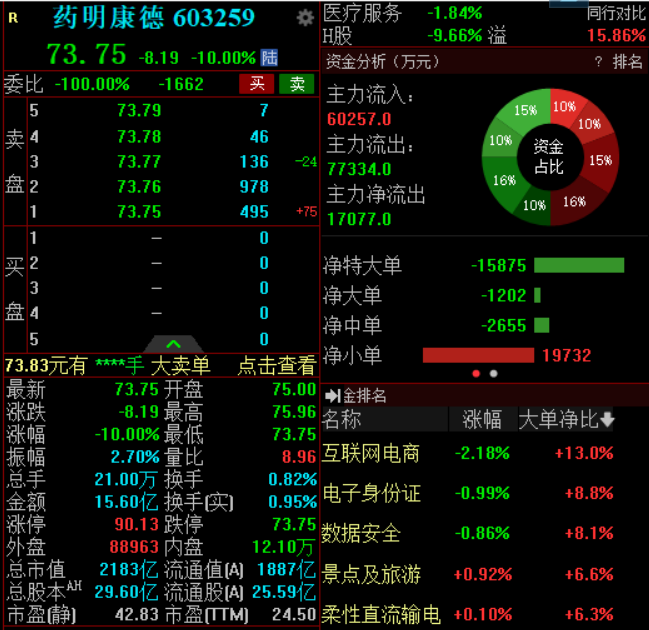 11月28日,药明康德A股、港股双双大幅低开,截至发稿,药明康德A股跌停,报73.75元。