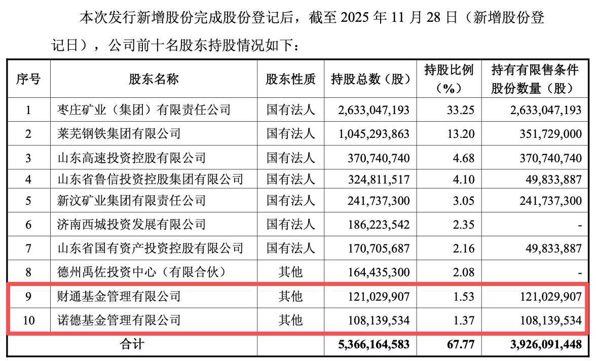 从最新的前十股东名单来看,截至2025年11月28日,控股股东枣矿集团通过本次定增豪掷21.65亿元认购,持股比例从32.84%微升至33.25%,进一步巩固了控股地位。原有核心国资股东持续增持,进一步夯实国有资本主导地位。