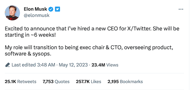 “我很高兴地宣布,我已经为推特聘请了一位新的首席执行官(CEO)。她将在6周后开始工作!我的角色将过渡到执行主席和首席产品官(CTO),监督产品、软件和系统管理员。”