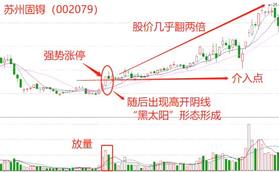 苏州固锝同样走出“黑太阳”走势,上图中所圈住的部分便是“黑太阳”组合,可以看到第二天阴线高开,且相对来说这个形态是一个突破的位置,如果能够在第二天最低价介入,那么持股到阶段性高点股价基本实现了翻倍。