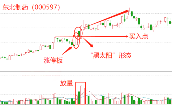 上图是东北制药的股价走势图,我们能够看到该股在处于阶段性拉升波段中出现了一个涨停板,而后后一天出现高开,量能配合放大,当天收出一根放量的大阴线,形成了一个标准的“黑太阳高飞”k线形态。在第二天的尾盘可以介入,之后股价继续开启阶段性拉升,介入的投资者同样可以获益。