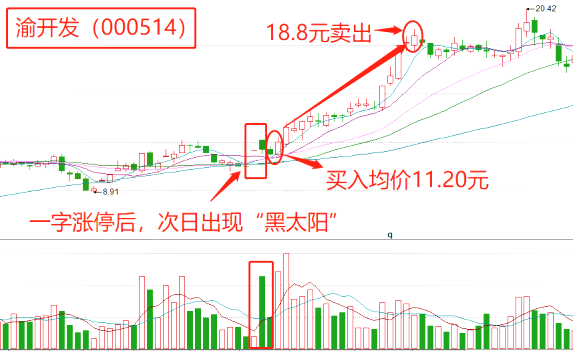 从渝开发的股价k线走势图我们能够看到,在经历了一天停牌之后,渝开发复牌即涨停,而后一天高开约5%,放出大量,当天拉出一根长阴,走出了一个标准的“黑太阳高飞”形态。我们的买入介入均价大约11.2元,之后经历了一波主升浪,在18.8元卖出可获得不错的收益。
