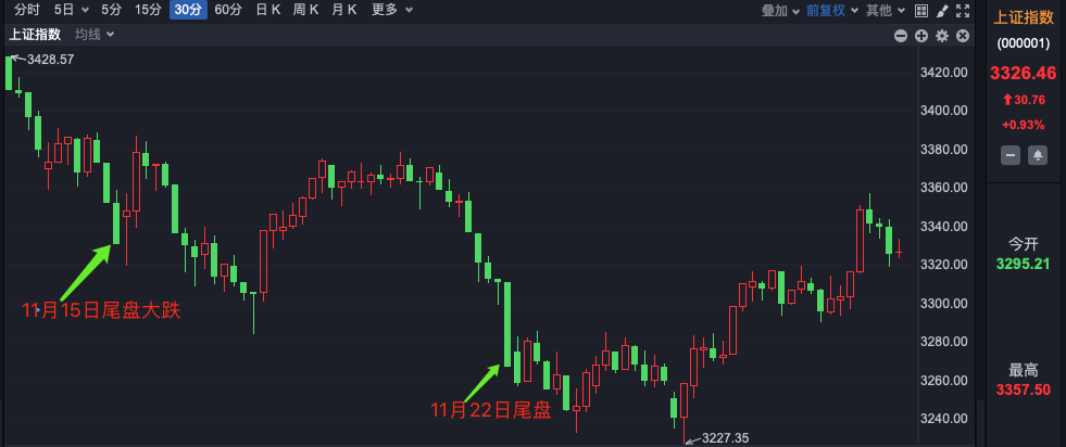 进入11月以来,周五尾盘跳水似乎成为了A股的“惯性”。在刚刚过去的两个周五(11月15日、11月22日)尾盘,股市均出现了较大幅度的回调。但今天,A股尾盘稳住了,三大指数集体收涨。