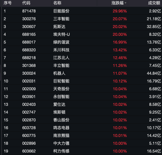机器人概念股午后大爆发,巨能股份、三丰智能、拓斯达等超20股涨停或涨超10%。
