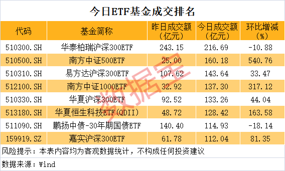 今天“国家队”继续买入的迹象明显,部分ETF基金出现明显放量迹象,且买入方向开始向中小盘股、科技股扩散。其中,南方中证500ETF成交额超160亿元,较昨日放量超5倍;南方中证1000ETF成交额超137亿元,较昨日放量超3倍;华夏恒生科技ETF(QDII)成交超128亿元,放量超163%。另外易方达沪深300ETF、华夏沪深300ETF、嘉实沪深300ETF等也出现较大幅度放量。部分ETF虽有所缩量,但相比往日仍放量明显,其中华泰柏瑞沪深300ETF今天成交逾216亿元。