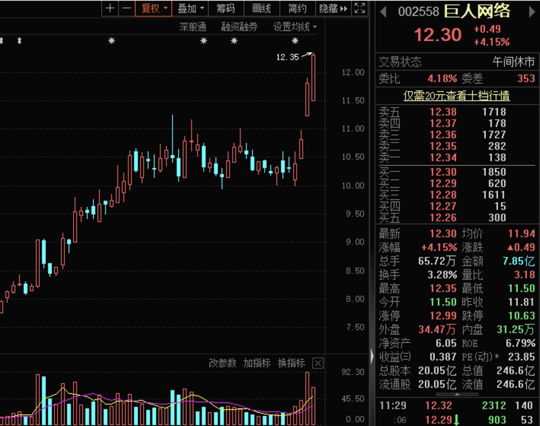 二级市场表现来看,巨人网络今年以来涨势喜人,昨日大涨,放量突破2月以来小平台,累计涨幅达50%。该股上午收盘报收12.3元/股,最新总市值246.6亿元,较年初增加超80亿元。