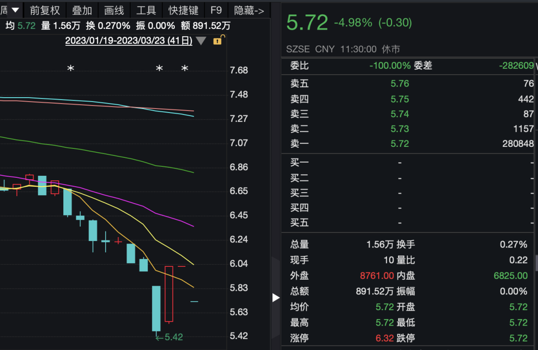 果不其然,在今天早盘复牌后*ST炼石开盘跌停。截至上午收盘,该股报收5.72元,下跌4.98%,封单超过28万手,整个上午维持一字跌停态势。值得注意的是,在停牌前一个交易日,该股一度收涨停。显然,对于此前一个交易日杀入的资金来说,无疑是惨遭“闷杀”了。