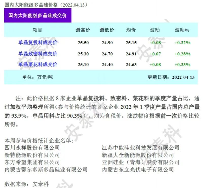 据硅业分会数据显示,本周国内多晶硅价格延续小幅上涨,其中单晶复投料、单晶致密料、单晶菜花料成交均价涨幅在0.3%左右。本周硅料成交相对清淡,主要由于绝大多数企业在月初已将4月份订单全量签订完毕,近期以执行前期订单为主,只有个别企业签订少量4月份散单和5月份订单。