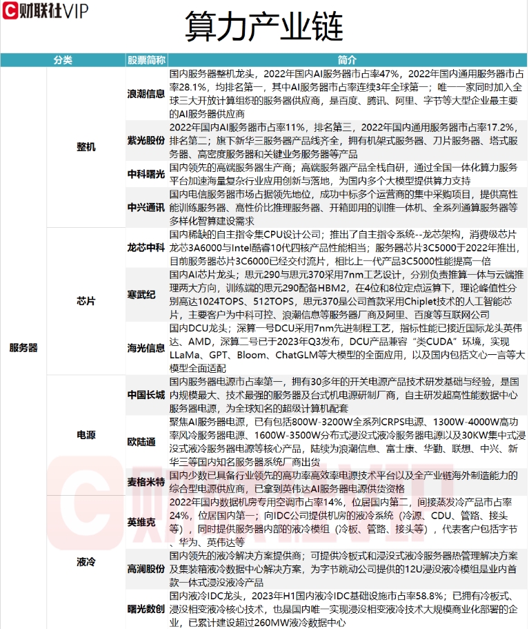 据财联社VIP盘中宝•数据栏目此前梳理,算力产业链中的服务器包括整机、芯片、电源、液冷等环节(具体详见下图)。二级市场方面,上述细分行业中的紫光股份、寒武纪(20%)、海光信息、欧陆通(20%)、英维克、曙光数创等周五收盘涨停或涨幅超10%。