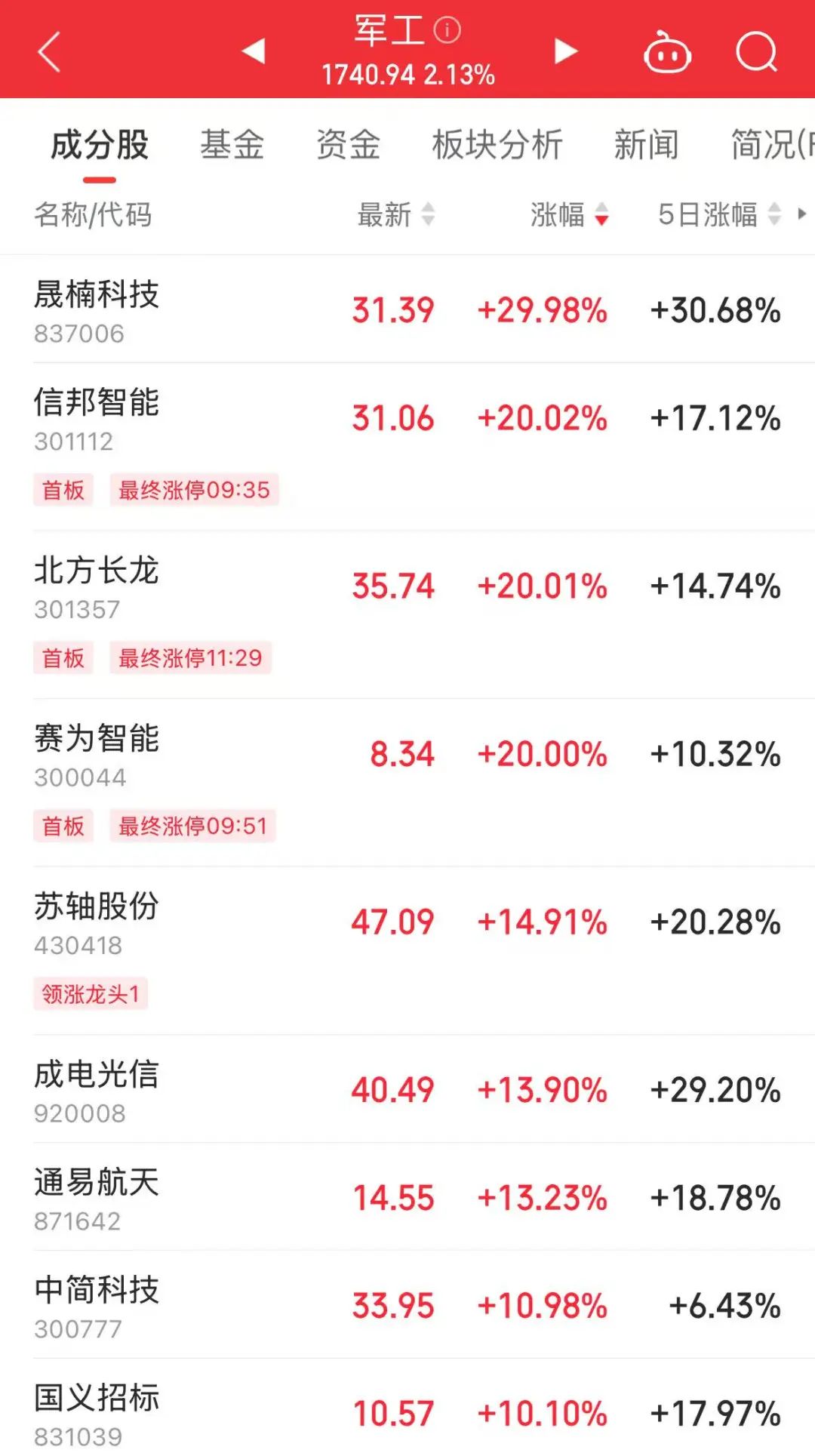 军工题材股中,信邦智能、北方长龙、赛为智能等“20cm”涨停,北化股份、新兴装备、立航科技、龙溪股份等触及“10cm”涨停。涨幅靠前的还有天和防务、航新科技、启明星辰、新雷能、星网宇达等。