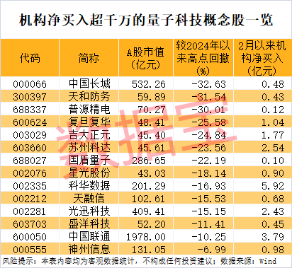 从资金流向来看,截至3月3日收盘,机构资金2月以来净买入超千万元的量子科技概念股有14只,其中科华数据、中国联通、苏州科达、光迅科技、吉大正元、复旦复华获机构净买入逾亿元。
