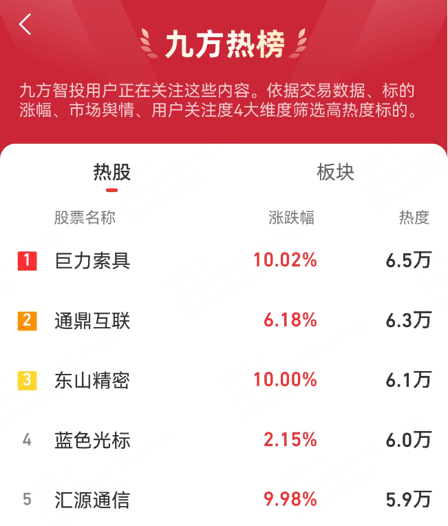 九方热榜:巨力索具,通鼎互联,东山精密,蓝色光标,汇源通信