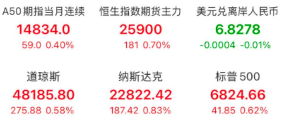 A50指数上涨0.40,恒生指数期货上涨0.70%。
