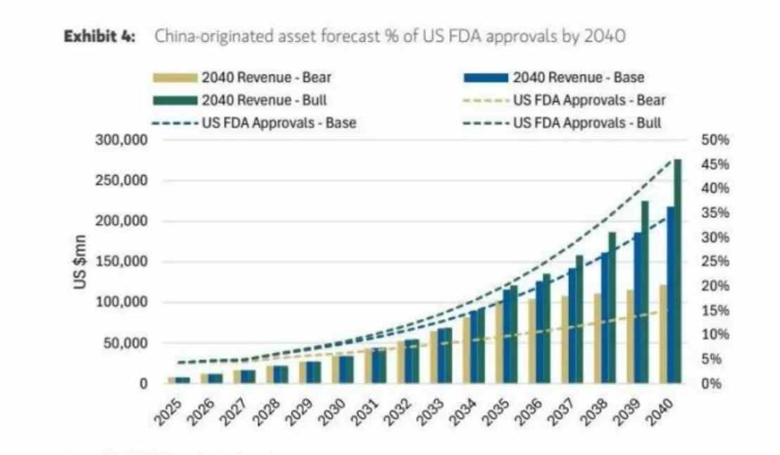 数据显示,有近200种药物(包括年销售额超过10亿美元的69种重磅药物)即将失去其专利保护。据摩根士丹利最新研报披露,2035年MNC将出现高达 1150亿美元的专利悬崖,其中400亿美元缺口需在2030年前填补。而中国创新药凭借研发效率、成本优势及政策红利,将成为填补全球1150亿美元专利悬崖的关键力量,预计到2040年中国研发的药品将在中国境外创造约2200亿美元的收入,占美国FDA批准总量的35%。