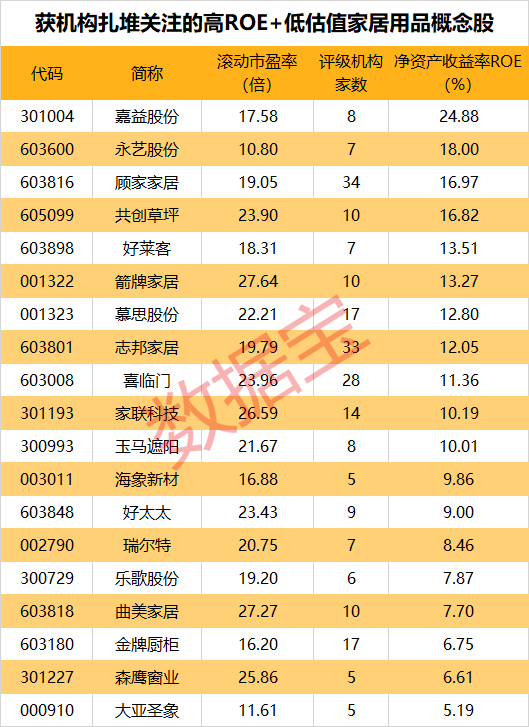证券时报·数据宝统计,估值小于30倍、机构评级数量有5家及以上且ROE超5%的家居用品概念股有19只。其中顾家家居、志邦家居、金牌厨柜今年以来分别获北上资金加仓443.47万股、335.77万股、89.08万股。