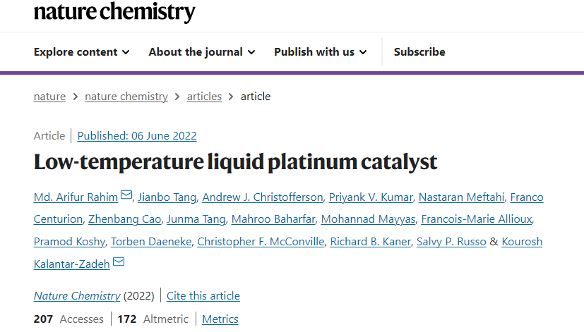 现在,澳大利亚的研究人员发现了一种新方法,可以大幅减少这些反应所需的铂量。该团队没有将铂原子固定在固体基质上,而是找到了一种将它们悬浮在液体中的方法,使其更高效、可重复使用。这项研究成果已于近期发表在了《自然化学》杂志上。