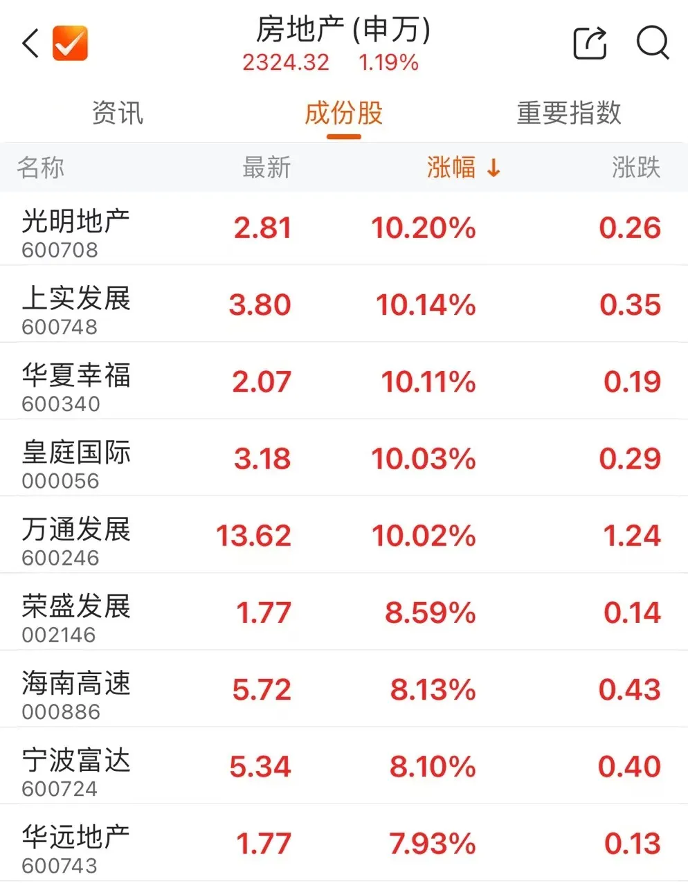 房地产板块今日盘中发力走高,华夏幸福走出3连板行情。截至午间收盘,光明地产、上实发展、华夏幸福、皇庭国际、万通发展等涨停。