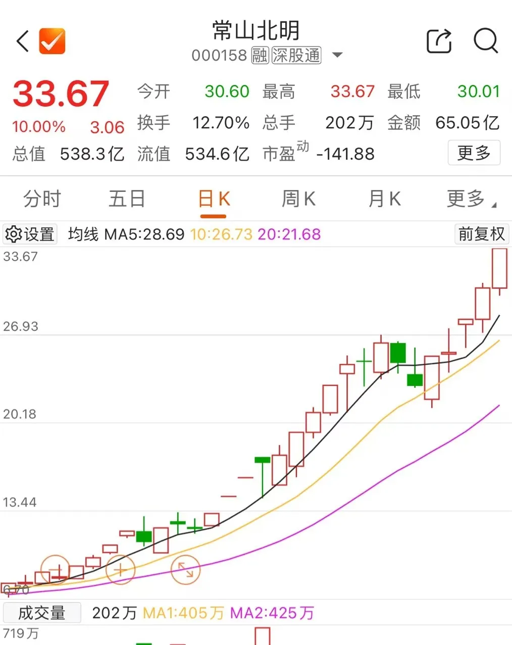 热门股常山北明今日再度冲击涨停,股价再创历史新高。截至午间收盘,常山北明报33.67元,成交额65.05亿元,最新总市值538.3亿元。