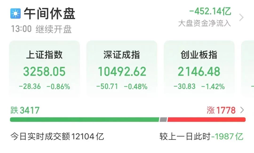 周三早盘,A股三大指数延续调整态势。截至午间收盘,上证指数跌0.86%,深证成指跌0.48%,创业板指跌1.42%。成交量方面,A股市场半日成交额1.21万亿元,较上个交易日同期缩量1987亿元。