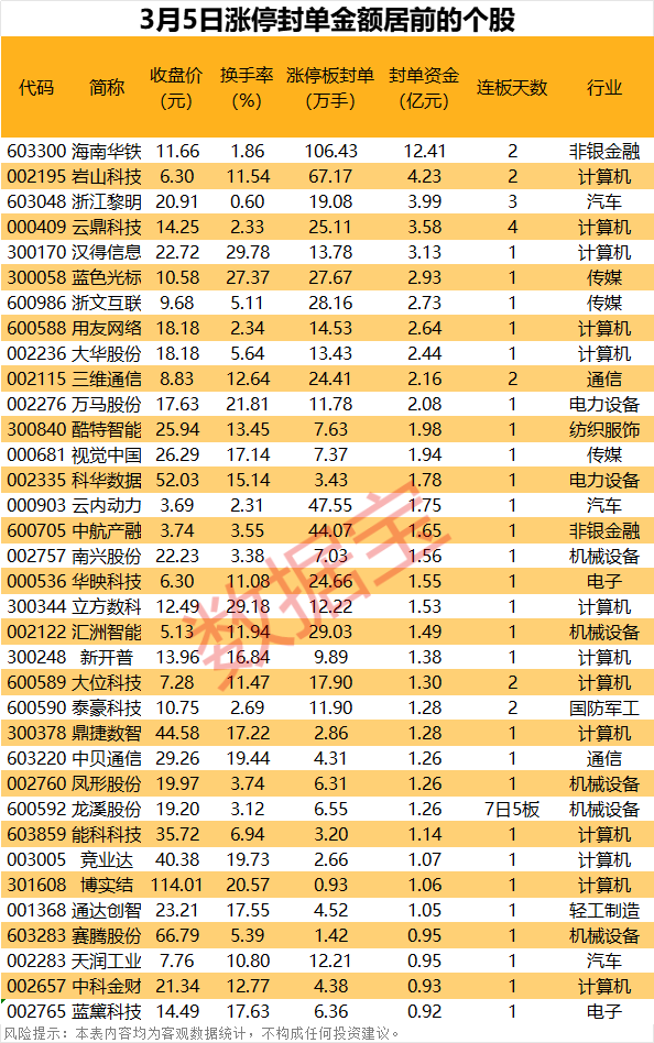 以封单金额计算,31股封单金额超亿元,海南华铁、岩山科技、浙江黎明封单金额居前,分别为12.41亿元、4.23亿元、3.99 亿元。