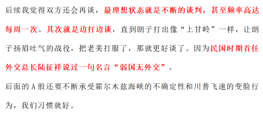 昨天我们也说过对于现在行情的应对策略。不过度乐观:压制谈判一定能成。也不过度悲观,双方又撕破脸。我们做好优质股票的研究,市场真跌了,那反而是机会。