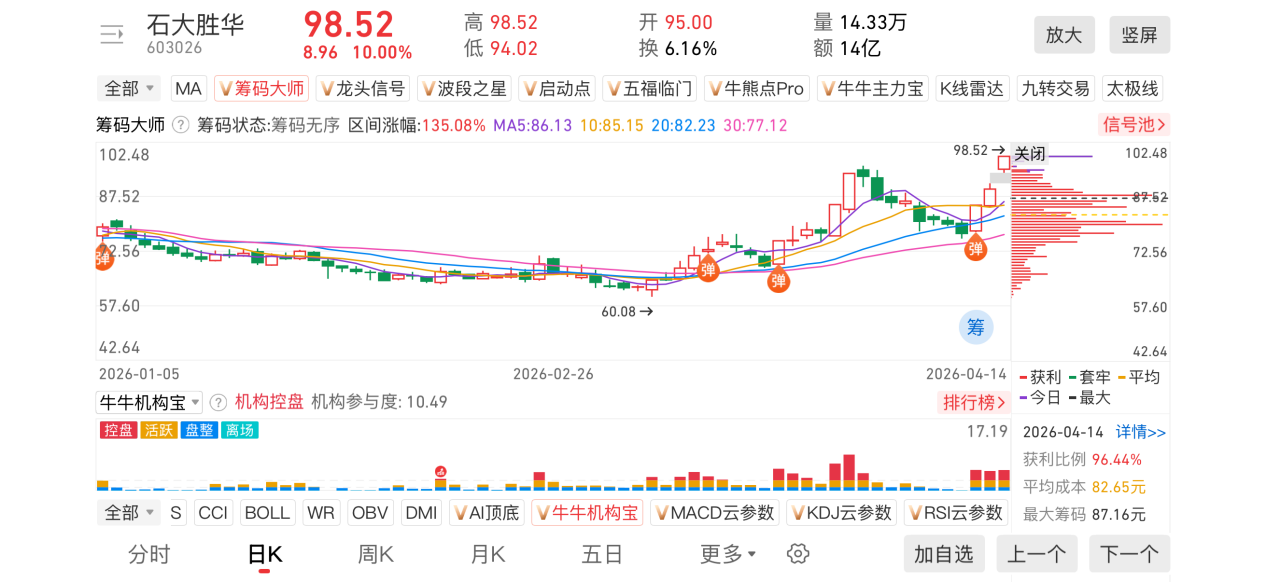 1)20260414-石大胜华-603026-【筹码大师】和【牛牛机构宝】-近期出现弹信号且底部量柱由绿转红
