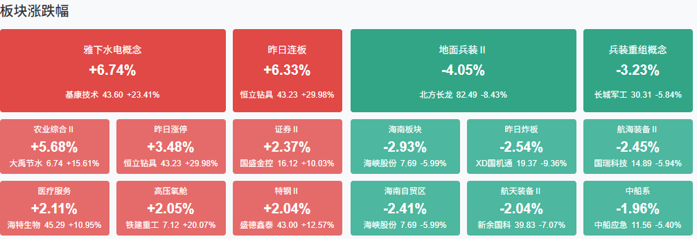 盘面上热点较为杂乱,个股跌多涨少,全市场超3100只个股下跌。从板块来看,超级水电概念股维持强势,中国电建等多股涨停。券商、保险等金融股集体走强,国盛金控涨停。钢铁股冲高回落,柳钢股份7天6板。下跌方面,军工股展开调整,长城军工等多股跌超5%。