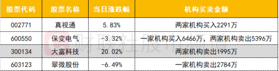卖出方面,折叠屏概念股大富科技遭机构卖出近2000万;移动支付概念股翠微股份遭机构卖出超2000万。