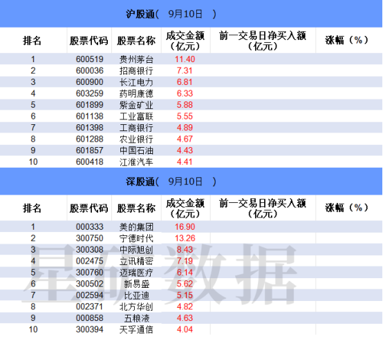 从沪股通前十大成交个股来看,贵州茅台位居首位,招商银行、长江电力成交额分居二、三位。