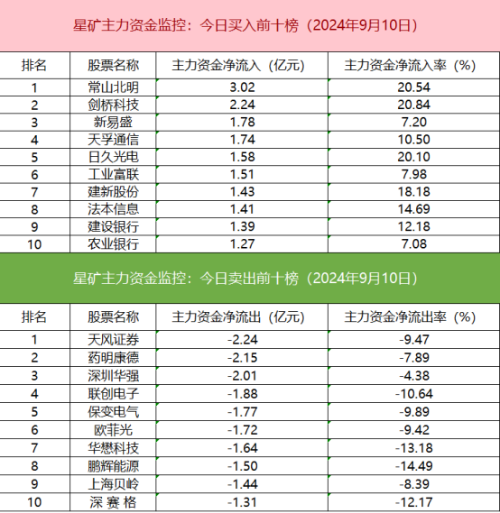 从个股主力资金监控数据来看,主力资金净流入前十的个股华为和CPO概念股较多,常山北明净流入居首。