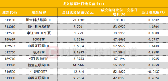 ①成交额环比昨日增长前十的ETF中有6只为港股相关ETF,其中恒生科技指数ETF(513180)成交额环比增长106%。