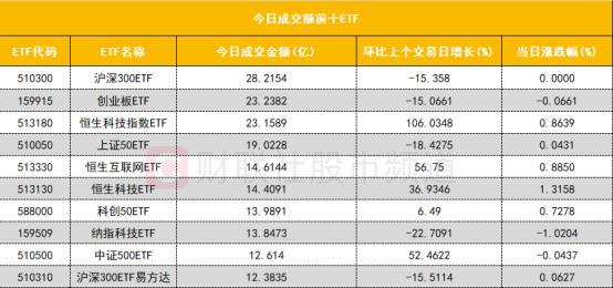 从成交额前十的ETF来看,沪深300ETF(510300)成交额位居首位,创业板ETF(159915)成交额位居次席,三只恒生指数相关ETF位居前十行列。