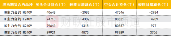 四大期指主力合约中,IH、IF合约多空双方均减仓,空头减仓数量较多;IC、IM合约多空双方均加仓,多头加仓数量均较多。