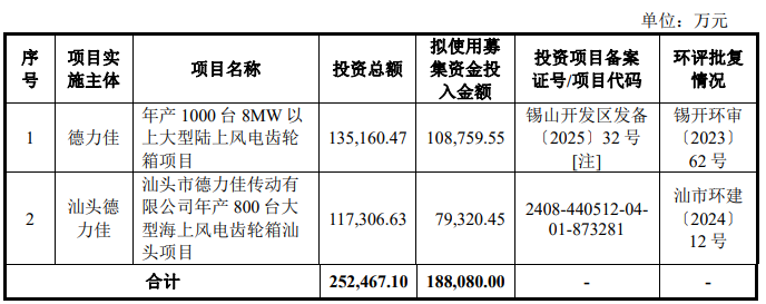 本次IPO募投项目“年产1000台8MW以上大型陆上风电齿轮箱项目”和“汕头市德力佳传动有限公司年产800台大型海上风电齿轮箱汕头项目”全部围绕主营业务进行,提高公司核心产品产能。
