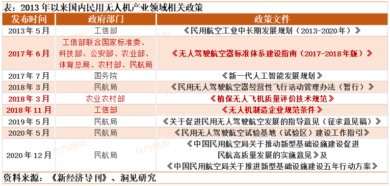 近10年以来,我国对于无人机产业发展在政策层面上予以了高度重视。2013年以来,中国民航局工信部科技部和农业农村部的相关部门,围绕无人机的研发、应用、战略定位和行业规范/标准等,做了大量的顶层设计工作。目前,国内民用无人机产业在主要行业方向上具备了规范化发展的基础与环境。